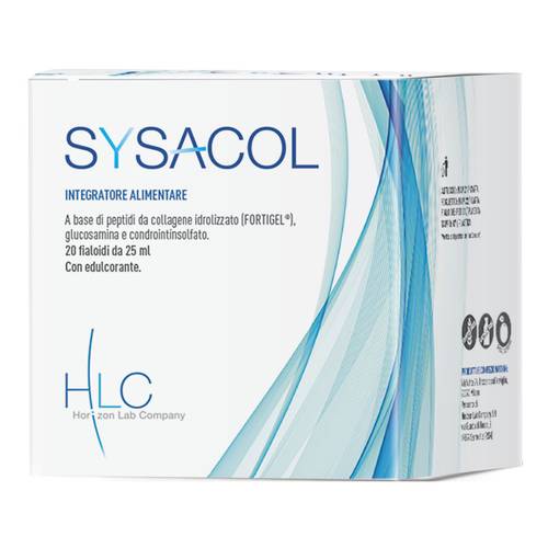 SYSACOLDescrizione Integratore alimentare a base di peptidi da collagene idrolizzato (FORTIGEL), glucosamina e condroitinsolfato. Con edulcorante. Gusto agrumi. Ingredienti Acqua depurata, FORTIGEL peptidi da collagene idrolizzato, D-glucosamina solfato 2KCl, condroitinsolfato sodico; acidificante: acido citrico; aromi; conservanti: sodio benzoato, potassio sorbato; edulcorante: sucralosio. Senza glutine. Senza lattosio. Caratteristiche nutrizionali Tenori medi per dose giornaliera (1 fialoide) FORTIGEL peptidi da collagene idrolizzato 5 g Condroitinsolfato 500 mg Glucosamina 500 mg Modalità d'uso Assumere 1...